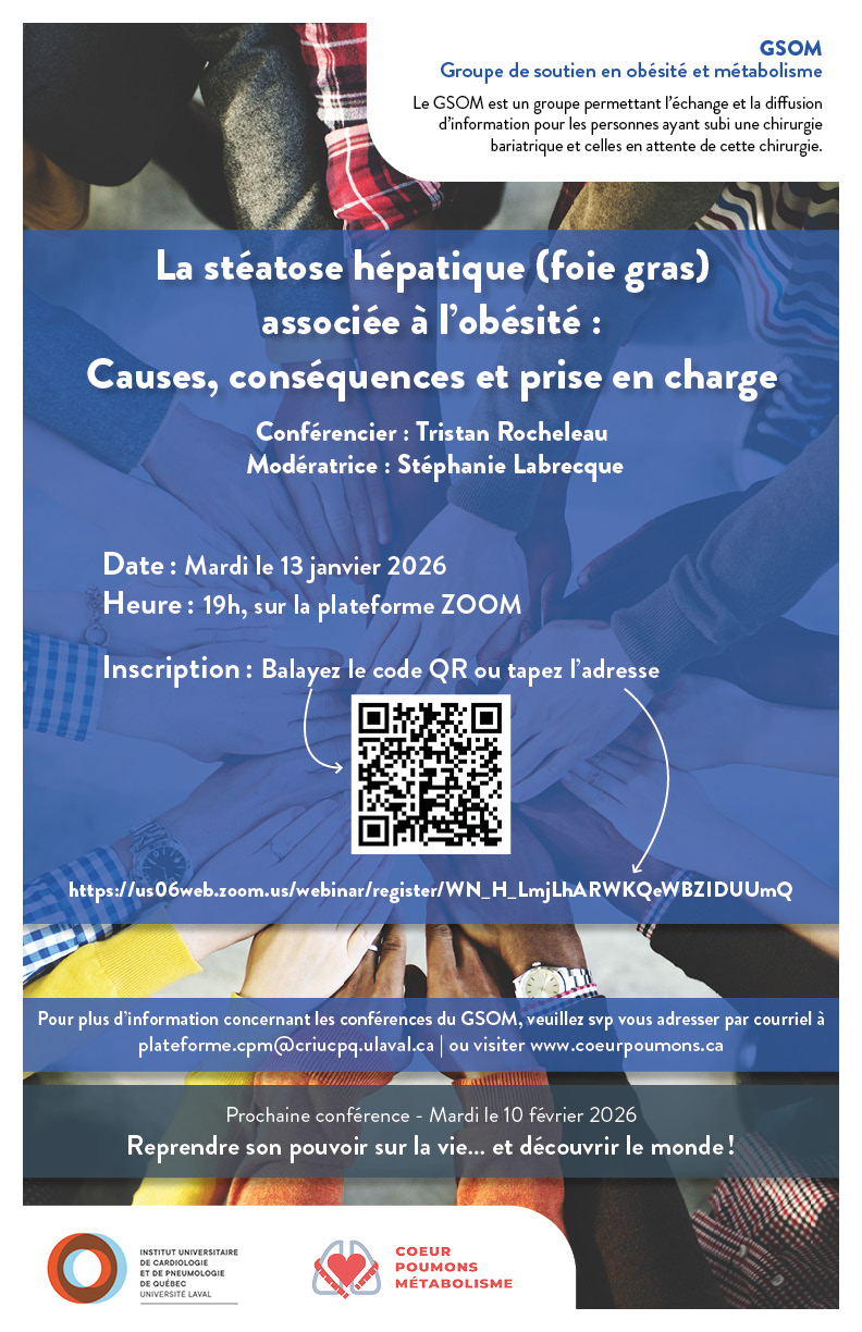 Grâce à l’effort et à l’implication de l’équipe de chirurgie bariatrique de l’IUCPQ, un groupe de soutien en obésité et métabolisme a été mis sur pied au printemps 2001. L’objectif du groupe consiste à faciliter une aide mutuelle entre les membres ayant vécu des expériences communes. Parmi ses rôles, le GSOM communique de l’information sur les différents sujets d’intérêts par l’entremise de rencontres-conférences. En 2024, la reprise des conférences mensuelles a été rendue possible grâce à la participation de l’équipe de chirurgie bariatrique, avec un soutien de la Fondation IUCPQ.